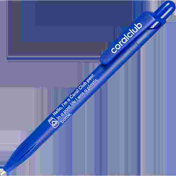 Kuličkové pero s tlačítkovým mechanismem vyrobené z PET RECYKLOVANÉHO materiálu s nápisem "Ahoj, jsem pero Coral Club! V minulém životě jsem byl plastový kelímek".